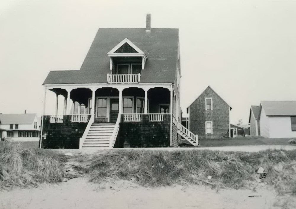 This history photo comes from a photo collection given by the previous owner to the current owners. Nothing unusual in that except more than a few things have changed. We often ask folks for old photos not just because we like to see pictures of their flowers, their cottages or events on the beach. Then we announce that we are really looking for what might be in the picture behind the primary subject....perhaps cottages which are no longer there or street scenes which have dramatically changed. In this case, there have definitely been changes to this grand old cottage at the corner of Ocean and Bayview. The wrap-around porch has been transformed into living space, the front and side steps are gone, and the back yard barn has been incorporated into the main house as a garage and new kitchen area. And perhaps the greatest benefit to those of us who don't happen to live on the waterfront is that the owners have permitted us to install a web cam on the side of that 2nd floor balcony.